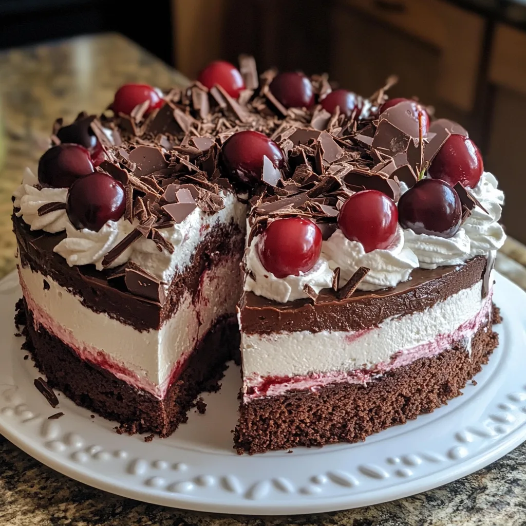 A rich and decadent dessert that combines layers of chocolate mousse and cherry filling, inspired by the classic Black Forest cake.