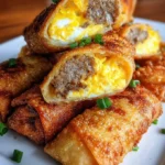 Delicious breakfast egg rolls filled with savory sausage, fluffy scrambled eggs, crispy hash browns, and melted cheese, all wrapped in crunchy egg roll wrappers.