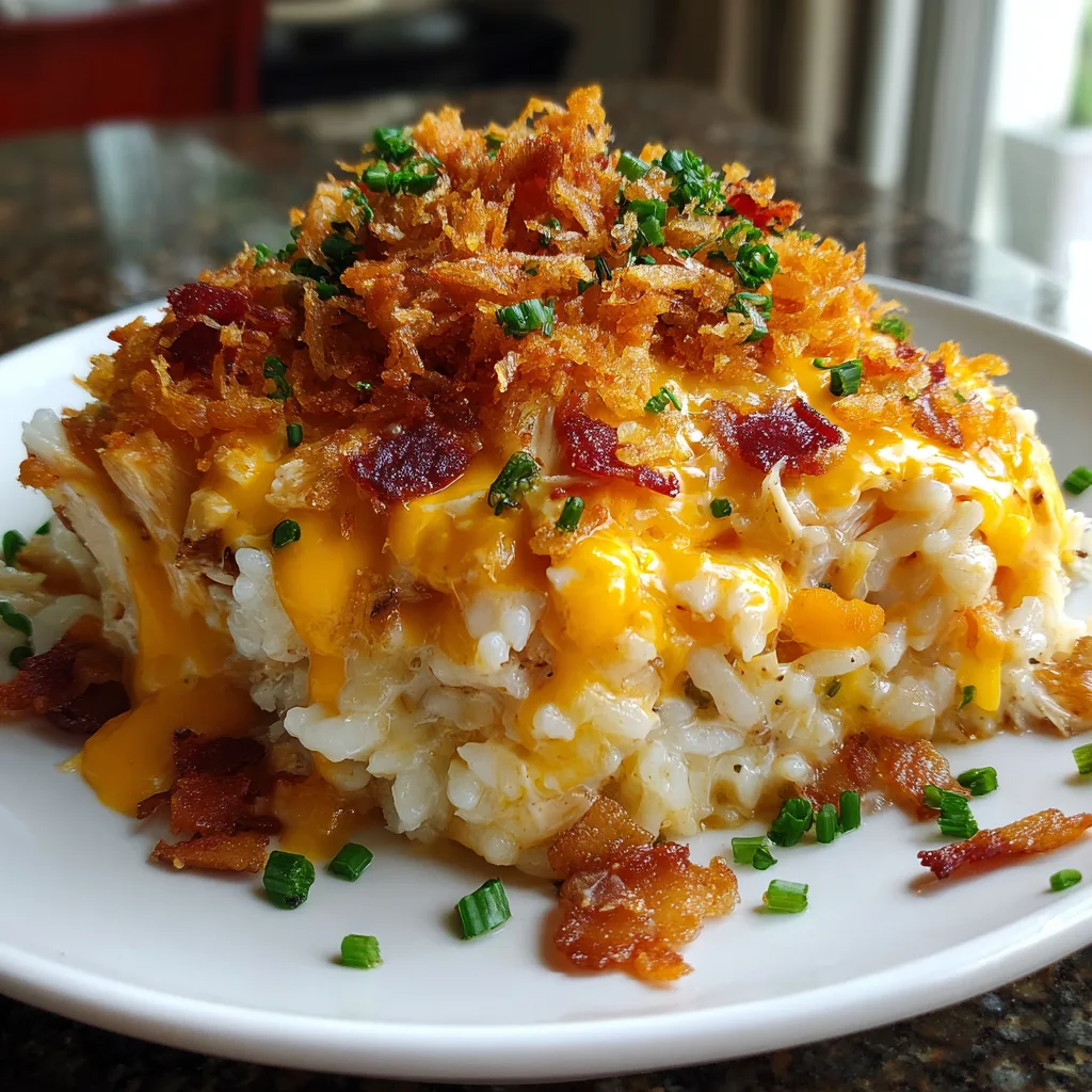 A delicious and comforting casserole featuring tender chicken, creamy cheese, and flavorful ranch seasoning, all baked with rice for a complete meal.