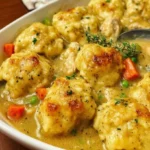 A comforting bowl of Chicken and Dumplings, featuring tender chicken and fluffy dumplings in a rich savory broth.
