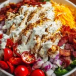 A comforting Chicken Bacon Ranch Bowl featuring tender chicken, crispy bacon, fresh greens, and creamy ranch dressing, perfect for any meal.