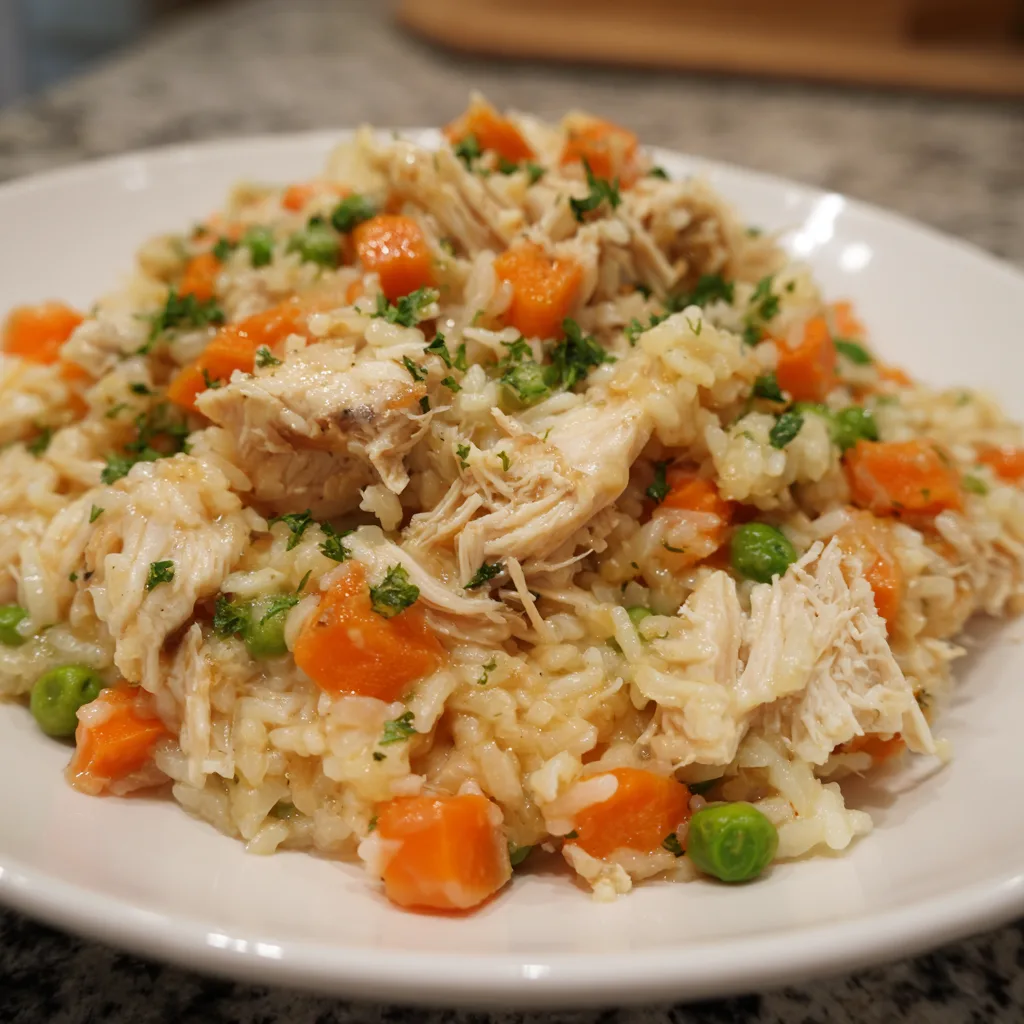 A simple and delicious Chicken and Rice Casserole featuring tender chicken, fluffy rice, and vibrant carrots and peas, perfect for a comforting family meal.