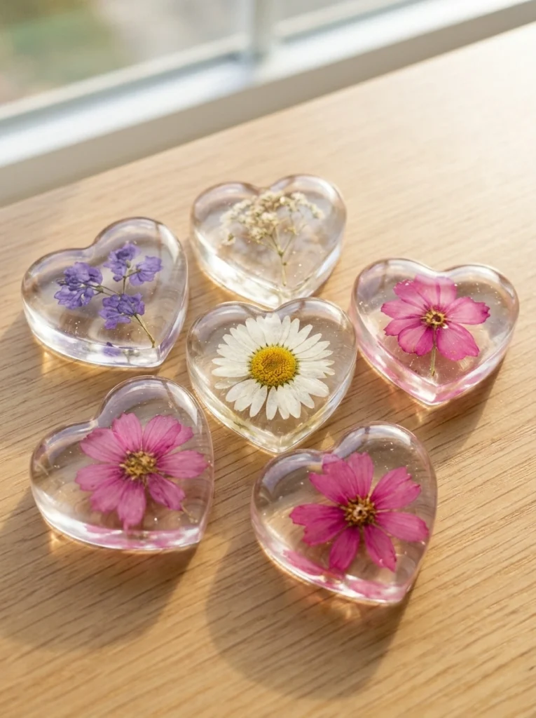 These little charms are simpler to make than they look and more beautiful than they sound. No baking. No special equipment. No craft store supplies beyond a silicone heart mold and a handful of flowers from the garden. Just a smooth, pourable mixture, a careful placement, and 24 to 48 hours of patient waiting — followed by the quiet satisfaction of popping a perfect, translucent heart from its mold and holding it up to the light.