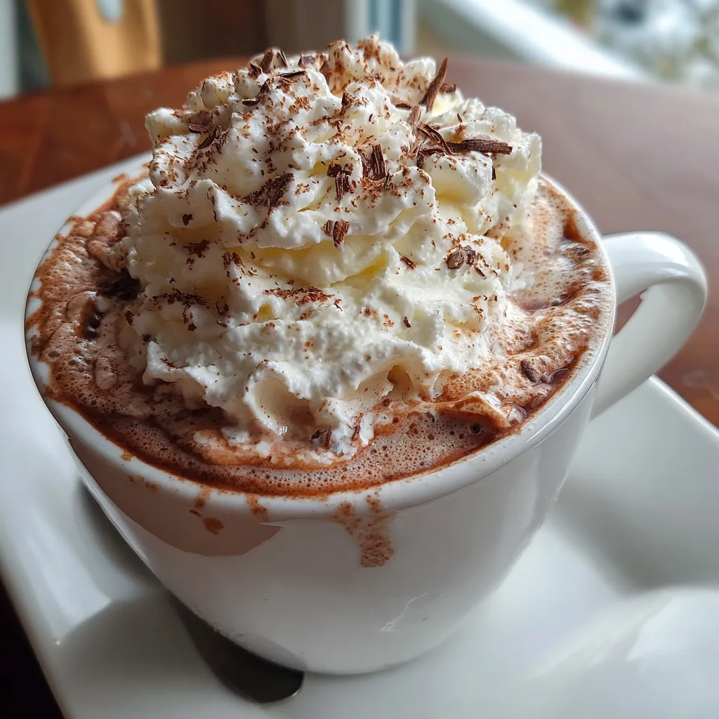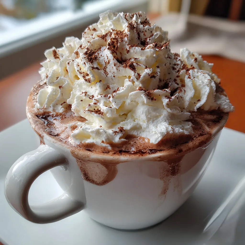 A rich and creamy hot chocolate topped with fluffy cinnamon whipped cream, perfect for cozy evenings.