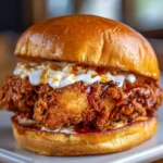 Keywords: Nashville Hot Chicken Sandwiches, spicy chicken sandwich, Southern cuisine, fried chicken, hot chicken recipe, brioche bun, coleslaw, comfort food, American food, homemade sandwiches, crispy chicken, cayenne pepper, marinated chicken, deep-fried chicken, easy recipes