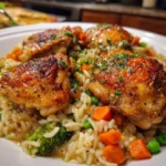 Imagine walking into your kitchen, greeted by the warm, inviting aroma of garlic and herbs wafting through the air. The sight of golden-brown chicken thighs nestled atop a bed of fluffy rice and vibrant vegetables instantly ignites your appetite. This Oven-Baked Chicken and Rice with Vegetables is not just a meal; it’s a comforting embrace on a chilly evening, a dish that brings families together around the dinner table. I remember the first time I made this recipe for my family; the joy on their faces as they took their first bites was priceless. Perfect for weeknight dinners or cozy gatherings, this dish is sure to become a staple in your home.