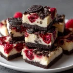 Keywords: Raspberry Oreo Cheesecake Bars, cheesecake bars, dessert bars, raspberry dessert, Oreo crust, creamy cheesecake, easy dessert recipe, no-bake cheesecake, summer dessert, fruity cheesecake, indulgent dessert, homemade cheesecake, sweet treats, party desserts, delicious bars