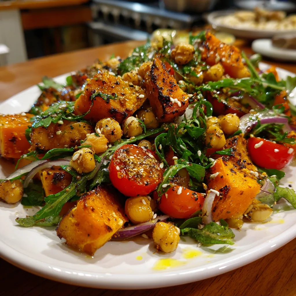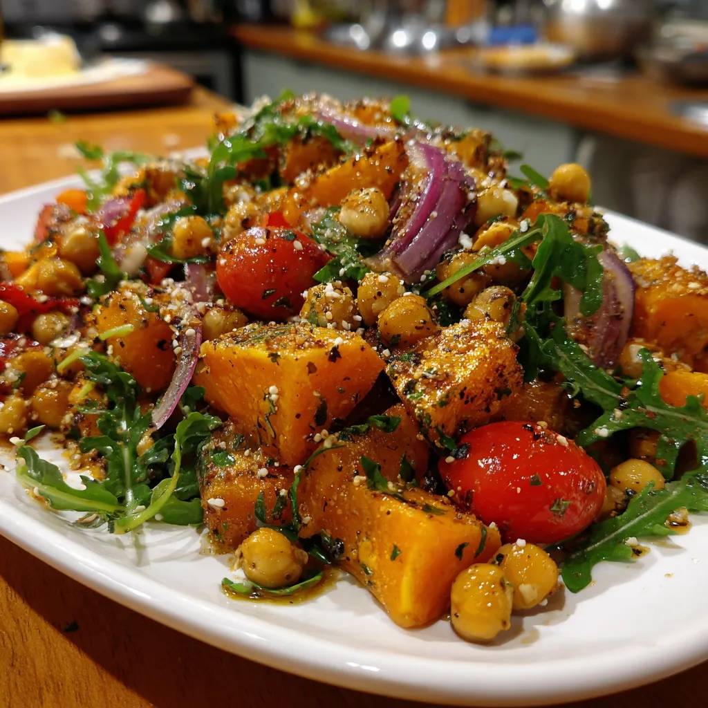 A delicious and nutritious salad featuring roasted pumpkin and chickpeas, perfect for a healthy meal.