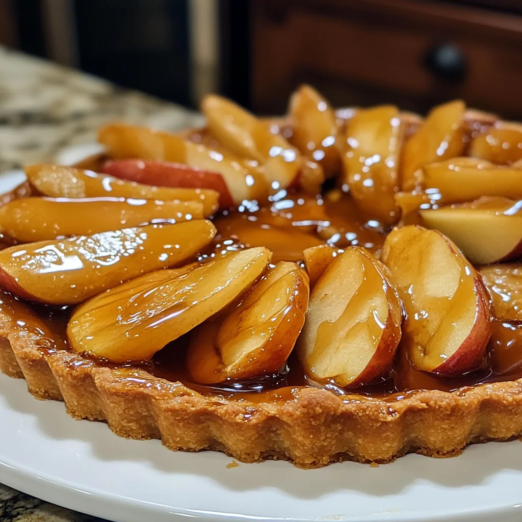 A delightful dessert featuring a buttery tart crust filled with sweet apples and topped with rich salted caramel.