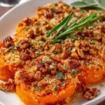 A rich and creamy sweet potato casserole topped with a crunchy breadcrumb and walnut layer, perfect for family gatherings and festive occasions.