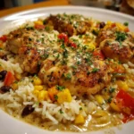Keywords: Southwest Ranch Chicken & Rice, creamy chicken dish, ranch chicken recipe, one-pan meal, easy dinner recipe, comfort food, chicken and rice, southwestern flavors, quick weeknight meal, family-friendly recipe, cheesy chicken, gluten-free dinner