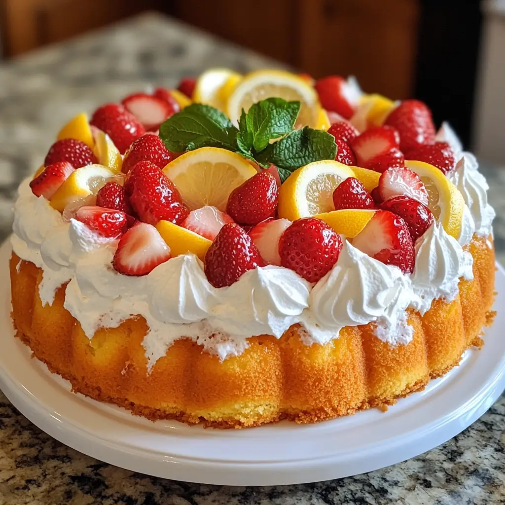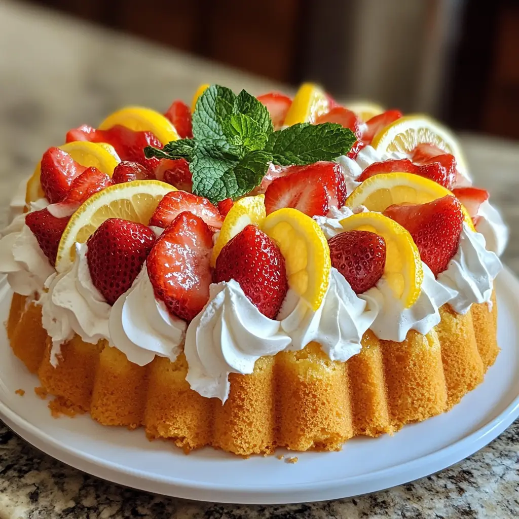 - Before serving, top the cake with whipped topping and fresh strawberries.