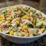 This Street Corn Creamy Cucumber Chicken Salad is a vibrant medley of flavors and textures, featuring juicy grilled chicken, crunchy cucumbers, and sweet corn, all enveloped in a creamy dressing. Each bite bursts with freshness, complemented by a hint of lime and a sprinkle of chili powder, making it a refreshing dish perfect for warm days.